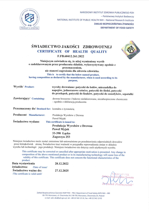 Posiadamy certyfikat FSC®C147822 DNV-COC-001809 – znak odpowiedzialnej gospodarki zasobami leśnymi, potwierdzający nasz odpowiedzialny sposób działania. Wszystkie nasze produkty mają Świadectwo Jakości Państwowego Zakładu Higieny, co oznacza, że mogą być przeznaczone do kontaktu z żywnością.